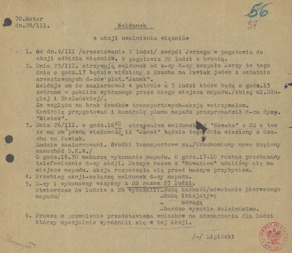 Uderzono u zbiegu ul. Bielańskiej, Długiej oraz Nalewki, gdy samochód-więźniarka, z „Rudym” oraz kilkunastoma innymi więźniami, jechała z Szucha na Pawiak. Niestety walka od początku nie przebiegała według założonego planu. „Zośka” strzelił do policjanta granatowego, który zauważył, co się dzieje i użył broni. Wywołało to z kolei reakcję gestapowca siedzącego w ciężarówce transportującej osadzonych. Mimo rzucenia w kierunku pojazdu butelek zapalających, nie udało się go całkowicie zatrzymać i auto jechało dalej. Dopiero atak grupy „Zośki” doprowadził do ustąpienia Niemców. „Rudy” oraz 20 innych więźniów zostało odbitych (chociaż meldunek KG AK z marca 1943 r. podaje liczbę 15 osób), jednak w czasie odwrotu oddział został zaatakowany przez grupę Niemców z Arbeitsamtu. W trakcie walki postrzelony został Maciej Aleksy Dawidowski ps. „Alek”, który mimo odniesionej rany, zdołał rzucić granat, co otworzyło drogę ucieczki.