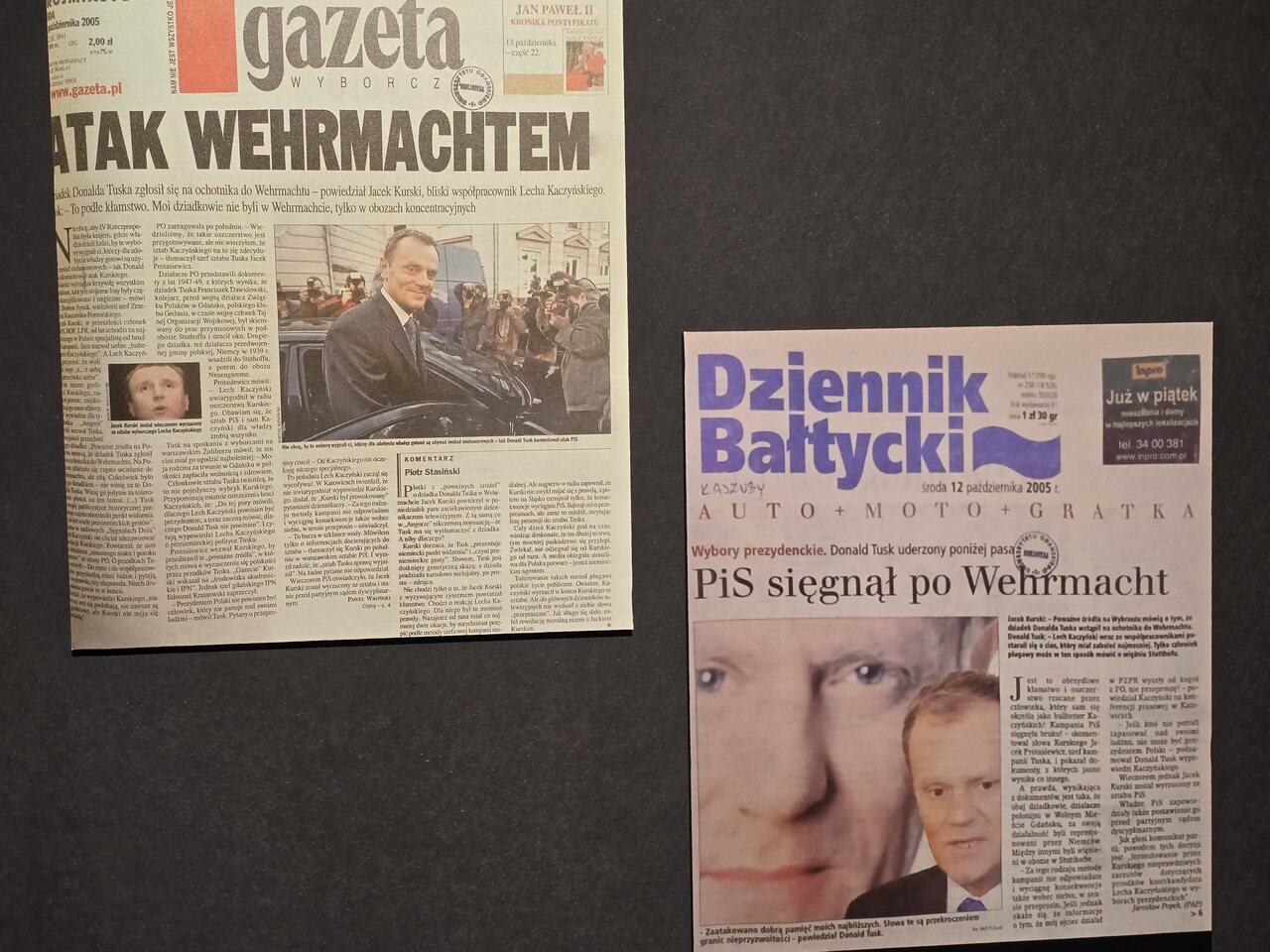 Na wystawie zobaczymy też trochę sprzętu, karabiny, hełmy, wyposażenie – tu mam wrażenie, że trochę tego za mało. Choć z drugiej strony to tak naprawdę tylko dodatek. To co mi rzuciło się w oczy i szczerze powiem, niezbyt spodobało to ściana z dwoma prasowymi artykułami na temat służby dziadka Donalda Tuska w Wehrmachcie, w tym jeden z krzykliwym tytułem „PiS sięgnął po Wehrmacht”. I serio po co to było? Odbieram to nie jako powód do dyskusji nad tematem wcieleń i służby Polaków w Wehrmachcie, a jedynie jako podsycanie polsko-polskiej wojenki. To było niepotrzebne.
