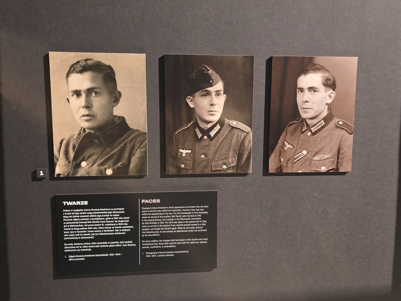 Skoro już przebrnęliśmy przez tyle spraw, to kilka słów jeszcze na temat samej wystawy. Uważam, że jest ona całkowicie i niepodważalnie potrzebna. Porusza jeden z najtragiczniejszych wątków polskiej historii. (Oczywiście jest jeszcze służba Polaków w Armii Czerwonej – ale to w tej dyskusji pomińmy). Na wystawie znajdziemy zdjęcia, dokumenty, listy osób wcielonych do wojska Hitlera. Ważnym wątkiem, który jest poruszony jest temat ich powojennego życia w realiach PRL. Czy musieli kryć się ze swoją przeszłością? Powszechnie wydaje się, że tak, a jednak w książeczkach wojskowych możemy zobaczyć szczegółowe wpisy z przebiegiem służby w obcej armii. A potem jeszcze często w Polskich Siłach Zbrojnych na Zachodzie. Ogromna ilość Polaków w niemieckim mundurze jeśli tylko miała taką możliwość to dezerterowała i oddawała się do niewoli. Po przybraniu fałszywego nazwiska wstępowali do polskiego wojska i walczyli z Niemcami, by wrócić do domu, do rodziny. (Fałszywe nazwisko dlatego, żeby po dostaniu się do niemieckiej niewoli okupant nie dokonał odwetu na jego rodzinie).